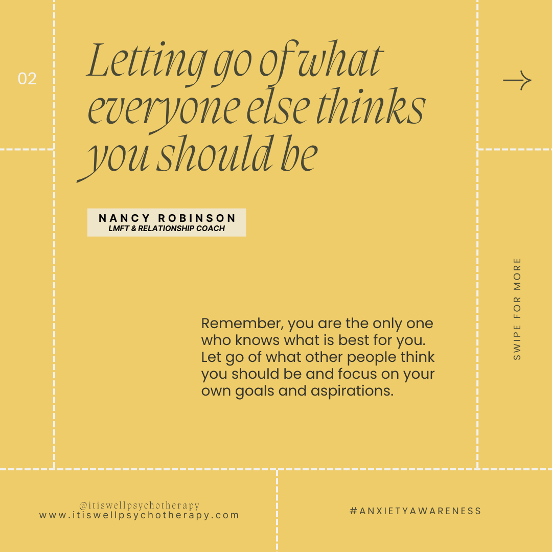 - Letting go of what everyone else thinks you should be: Oftentimes, we can feel anxious because we are worried about meeting other people's expectations. Remember, you are the only one who knows you best. Let go of what other people think you should be and focus on your own goals and aspirations.